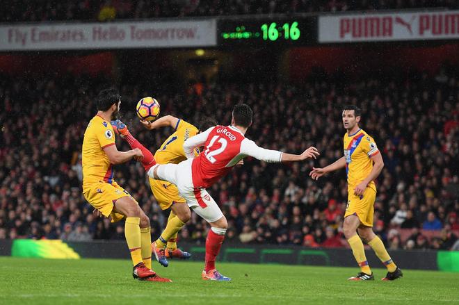 2017年1月1日,英超第19轮,阿森纳2-0战胜水晶宫。枪手从后场推进团队配合,桑切斯右脚传中,吉鲁灵光乍现,用蝎子摆尾的姿势将球勾入球门,这记鬼斧神工的进球也为他赢得了那年的普斯卡什奖。