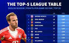 本赛季5大联赛场均拿分榜:拜仁2.8分领跑,皇马第2阿森纳第3